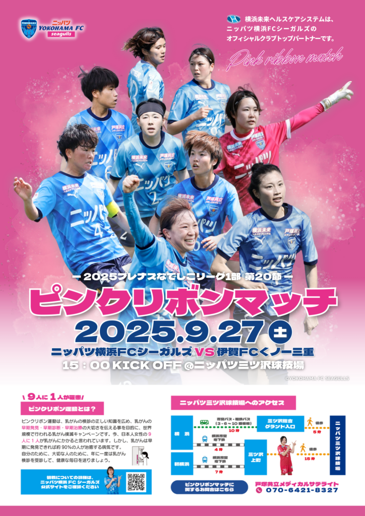 ニッパツ横浜FCシーガルズ と横浜未来ヘルスケアシステムが「乳がんピンクリボン運動」の一環として、ピンクリボンマッチを9月27日(土)に開催します。