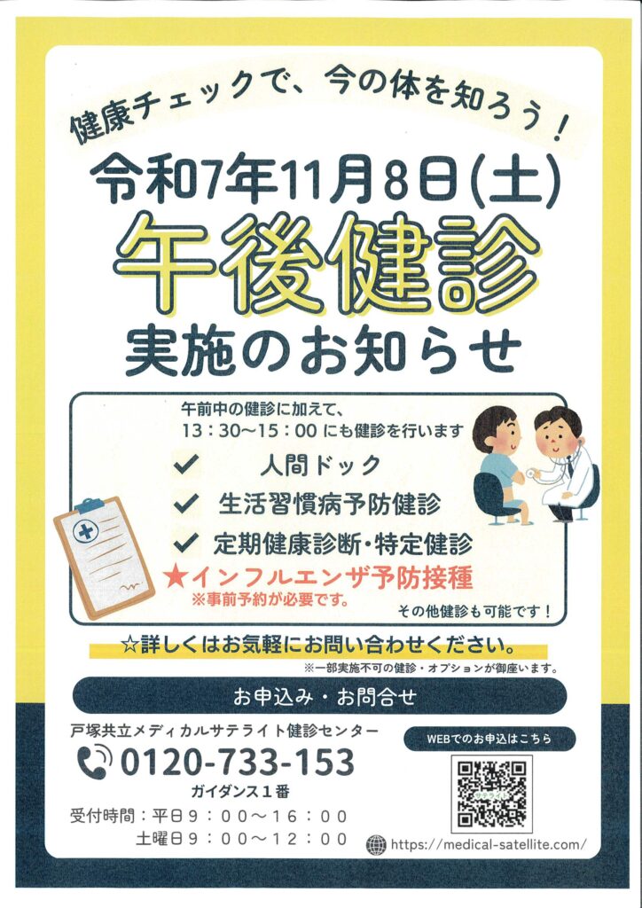 11/8(土)は午前中の健診に加え、13:00~15:00で健診を行います。