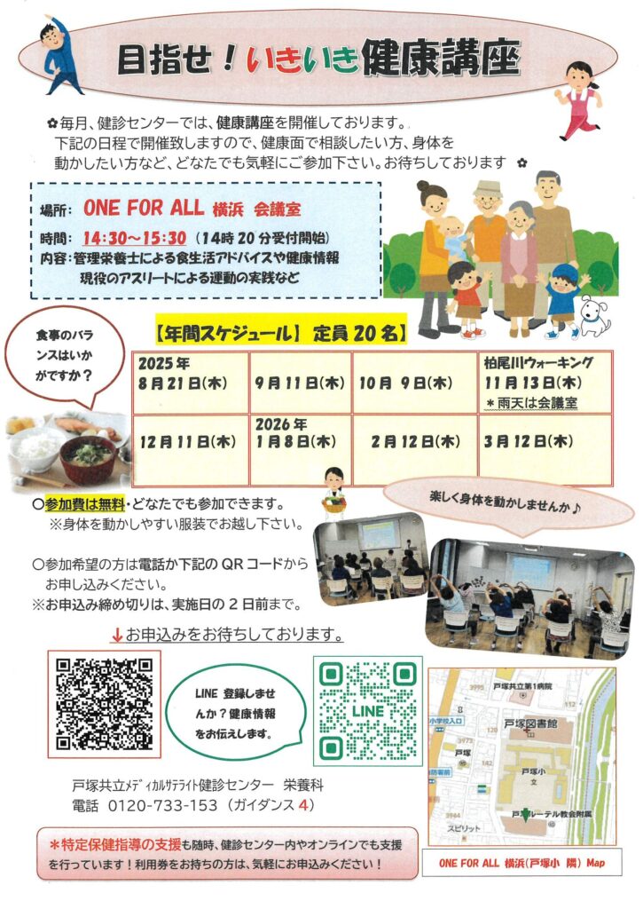 明日、10/9(木)14:30~15:30 ONE FOR ALL横浜地域交流施設(旧戸塚区役所跡地、戸塚小学校隣り)にて無料の「目指せ!いきいき健康講座」を開催いたします。