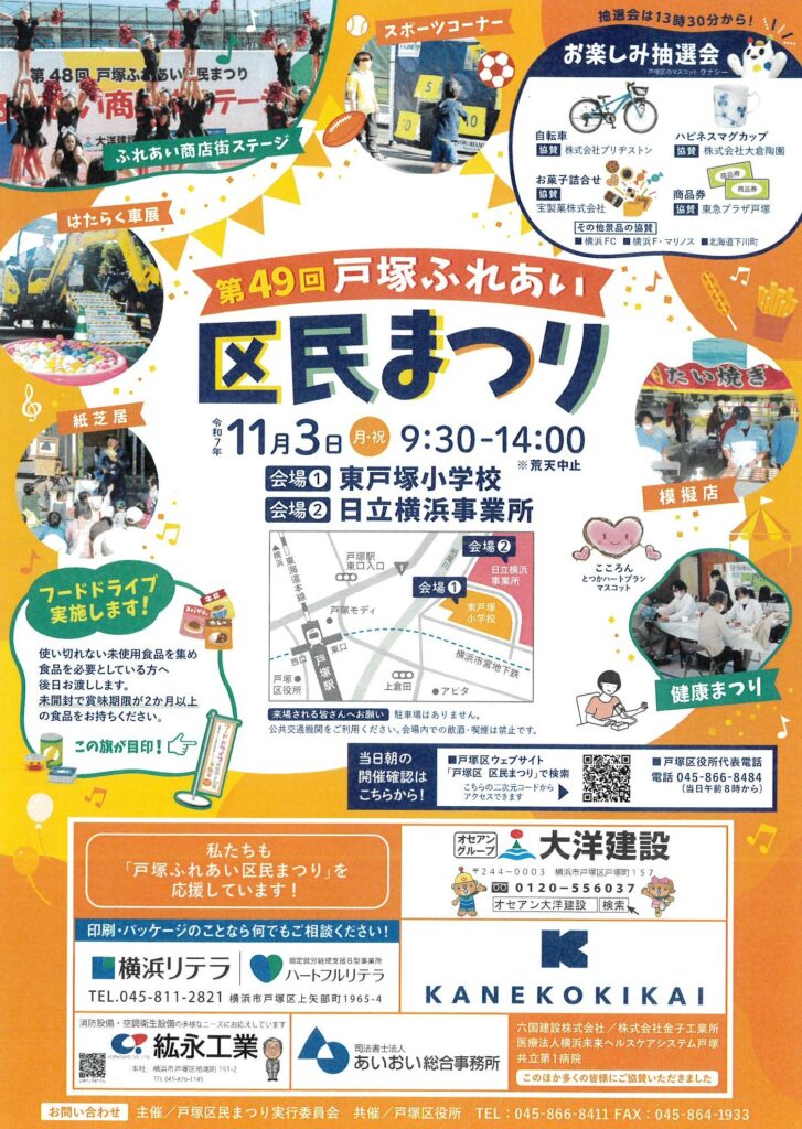 11/3(月・祝)9:30~14:00、第48回戸塚ふれあい区民まつりが東戸塚小学校、及び隣接の日立横浜事業所にて開催されます。