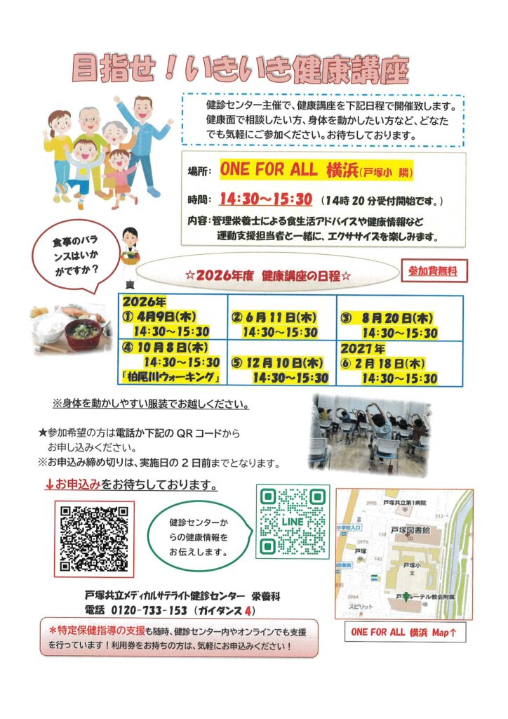 明日、4/9(木)14:30~15:30 ONE FOR ALL横浜地域交流施設(戸塚駅西口から徒歩8分、戸塚小学校隣り)会議室にて無料の「目指せ!いきいき健康講座」を開催いたします。