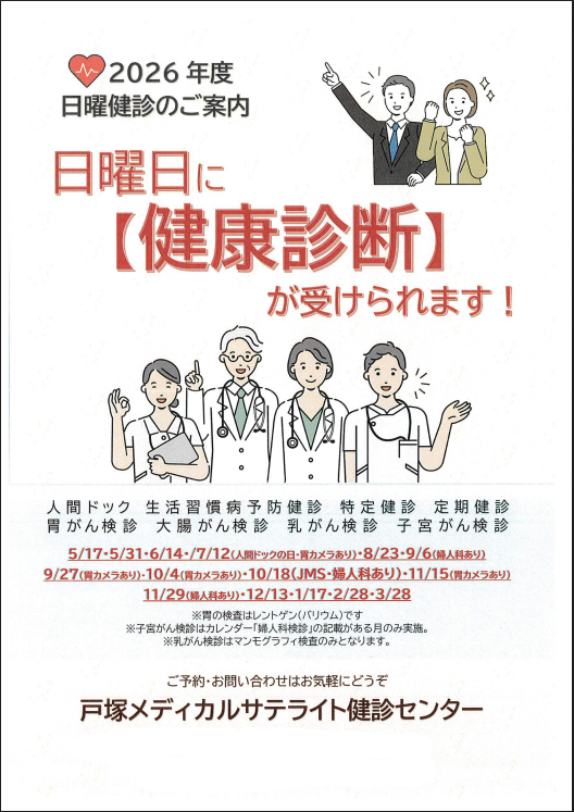 戸塚共立メディカルサテライト 健診センターでは、月に一度*日曜日に健診を実施しています。平日はお忙しい人も、ぜひこの機会に健康チェックしてみませんか?